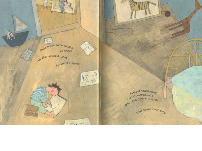 Итак, на все просьбы Миши завести какую-нибудь живность в доме родители отвечают: «Мы живем в центре города на четвертом этаже в маленькой квартирке без балкона», и это не очень подходящее место для домашних животных. Вот Миша (кстати, он такой вихрастый симпатичный мальчуган) сидит на полу и рисует зверей, которых он хотел бы, но не может иметь. Миша перебирает все возможные варианты: от слона до морской свинки, и его упорство и фантазия заслуживают уважения.
