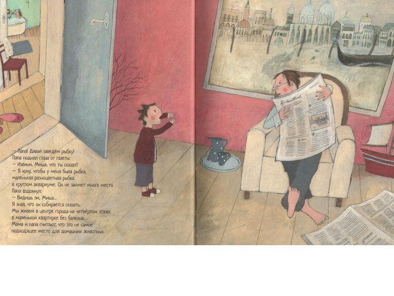 «Папа, давай заведем рыбку! Я хочу маленькую разноцветную рыбку в круглом аквариуме», – так начинается история о мальчике Мише, который мечтает стать хозяином какого-нибудь животного. Важно, что текст написан от лица самого Миши – это добавляет рассказу искренности. Текст украшают и спасают от чрезмерной сентиментальности стильные ироничные иллюстрации Даниэлы Бунге. Книжка получилась вполне гармоничная, тонкая и нежная. Думаю, во многом благодаря рисункам.