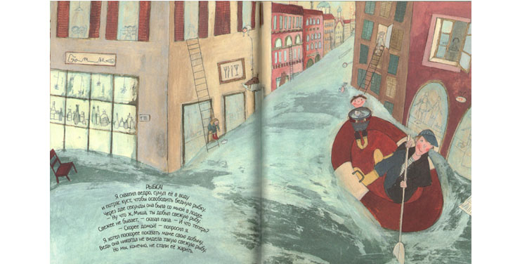 Из-за сильного дождя вода в реке поднялась и затопила город. Однажды Миша с папой (забавно, что они в одинаковых резиновых сапогах желтого цвета) плыли на надувной лодке по улицам города, который как будто ненадолго превратился в Венецию. И вдруг… «В кустах рядом с фонтаном билось в воде что-то блестящее. Может, дракон? А может, крокодил? Нет. Это была… РЫБКА!» Миша спас ее и торжественно повез в ведре домой. Федор сияет как начищенный самовар. Можно подумать, что он сам только что поймал рыбку. А замечательные иллюстрации поддерживают отличное настроение. Оказывается, жители города, пользуясь случаем стали купаться на улице, как в бассейне. Кто-то спускается по лестнице в воду прямо из окна своей квартиры, причем в полном снаряжении: полосатый купальник, маска, ласты. Кто-то зонтиком, привязанным к веревке, подтягивает наверх несколько озадаченную собаку. Кто-то пускает по воде бумажные кораблики.