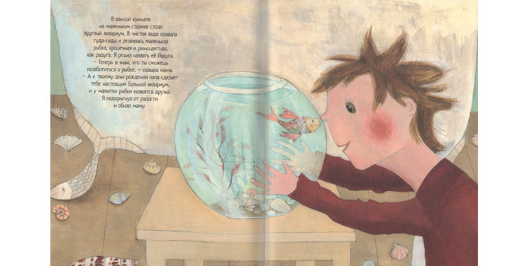 После прочтения этой книжки мы с Федором несколько раз играли в ванне с резиновыми рыбками семимесячного Макара (моего младшего сына). Только мы назвали их Килька и Барабулька. А еще Федор научился рисовать рыб: получаются этакие овальчики с «лохматыми» хвостами и плавниками. Вот так маленькая нежная книжка про мальчика и рыбок стала для моего сына источником довольно сильных переживаний.