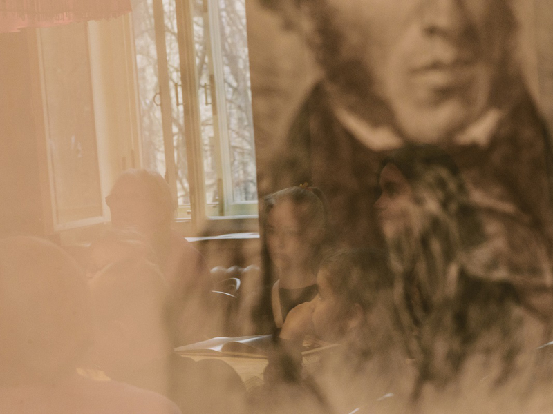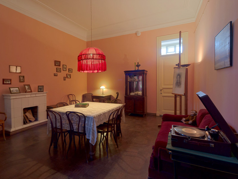 Как и на первой программе, мы начинаем занятие у дверей мемориальной квартиры Пуниных-Ахматовой: звоним в звонок, проходим по анфиладе комнат и устраиваемся в гостиной, за столом под красным абажуром. Кстати, здесь есть подлинные вещи, напрямую связанные с Осипом Мандельштамом. В посудном шкафу хранятся тарелки из столового сервиза отца поэта, а на кушетке у стены Осип Эмильевич ночевал в 1930-х годах, когда уже из Москвы приезжал в гости к Анне Андреевне.