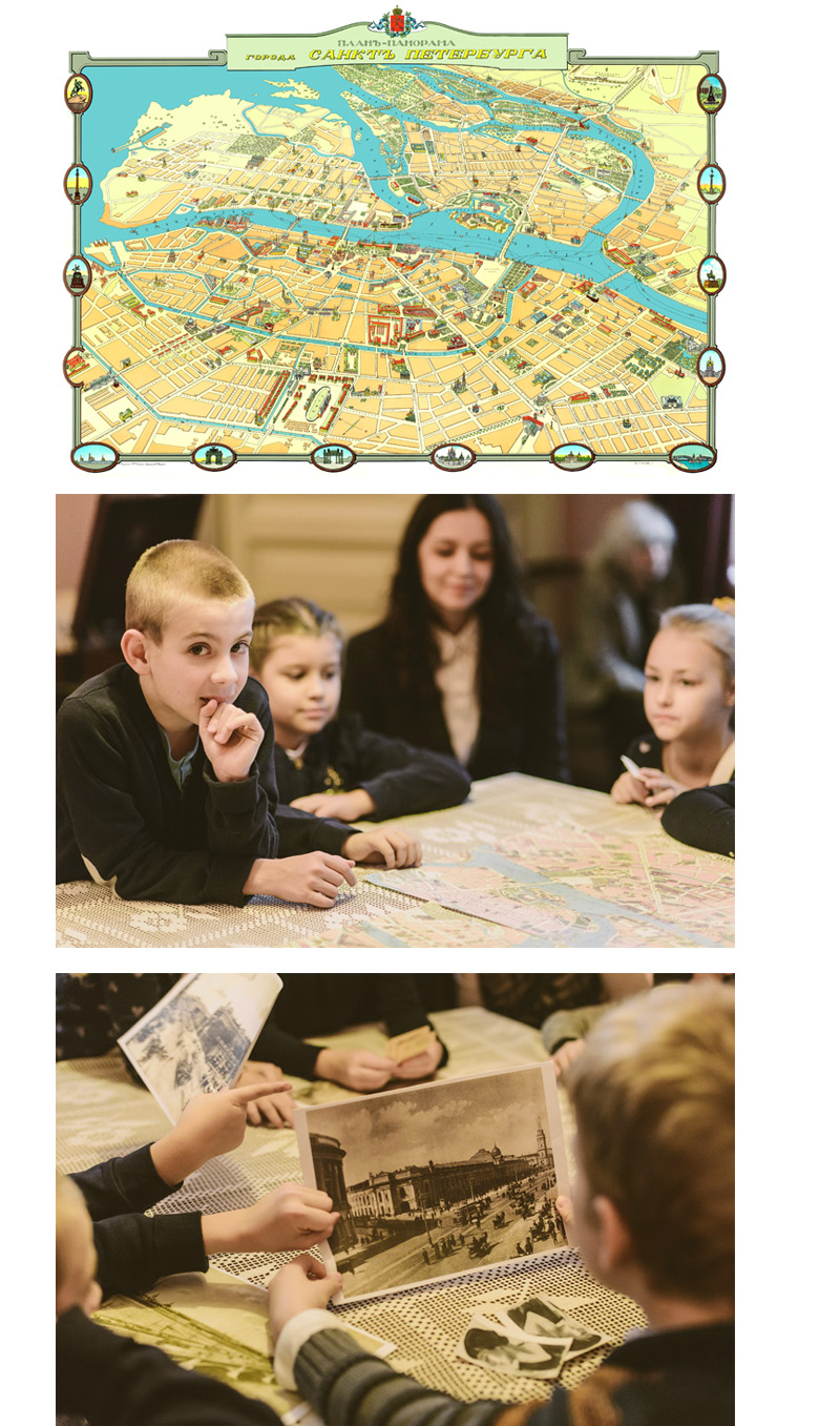 Мы работаем с копией плана-панорамы Петербурга 1913 года. На набережной Фонтанки дети отмечают Шереметевский дворец: в его флигеле расположена та самая квартира, где Анна Андреевна прожила более 30 лет и где мы сейчас находимся. Ведущий называет петербургские адреса Мандельштама: Большая Морская, 49 (в 1924 году он поселился здесь с женой, Надеждой Яковлевной) и 8-я линия Васильевского острова, 31 (дом брата, Евгения Эмильевича, и любимой племянницы Татки). И мы с детьми пробуем представить, как Мандельштам мог добираться к Ахматовой.