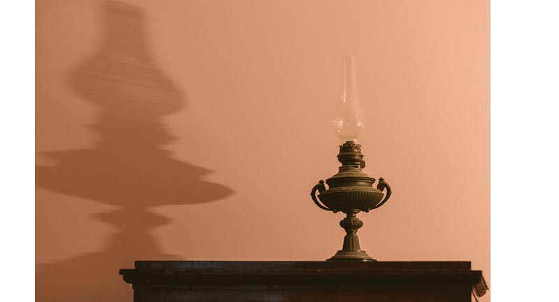 Керосиновая лампа на горке в гостиной, потому что «она тускло светит и отбрасывает тревожную тень на стену».