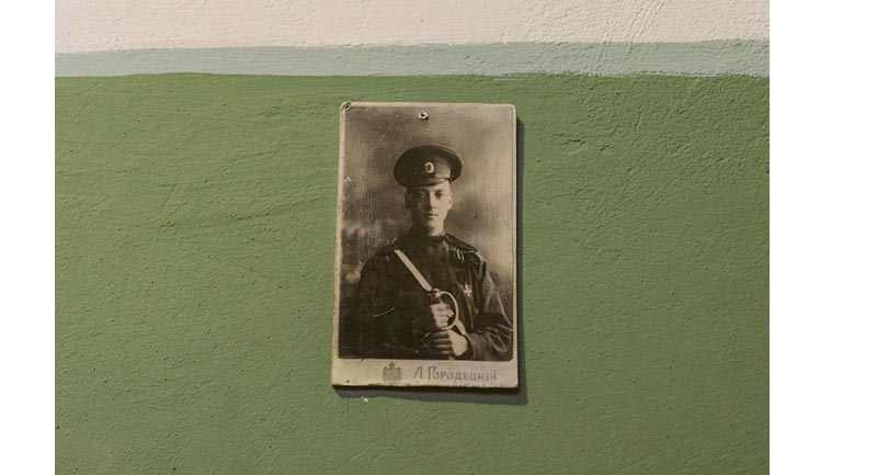 Фотография Николая Гумилева в гимнастерке в «тупичке» коридора, где одно время жил его сын Лев Гумилев, потому что «война – это всегда страшно».