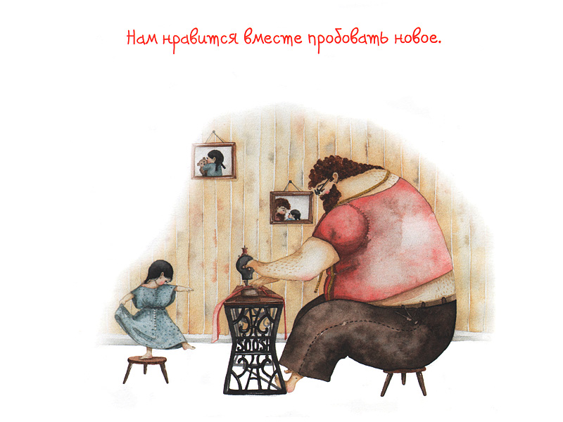 Вот девочка едет у папы на плечах. Вот папа показывает дочке кукольный спектакль, вот они вместе готовят, осваивают шитье на машинке. А вот «классическая» и в то же время метафорическая ситуация: папа измеряет рост дочки и наносит отметку на дверной косяк. А вот папа и дочка на диване…