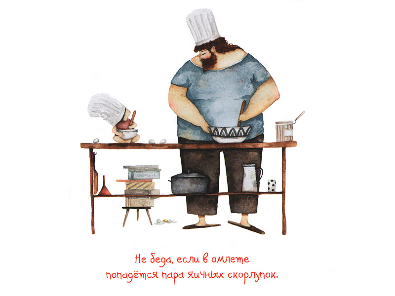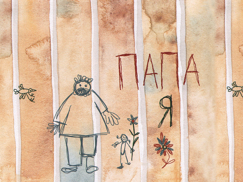 …у папы такие маленькие ступни! Это ведь не случайно? Такая деталь словно выдает «нездешность» папы, его не слишком сильную «укорененность» в реальной жизни. А папа к тому же не только огромный и не просто толстый. Благодаря акварели он кажется очень легким. А вдруг улетит? Как большой разноцветный воздушный шар?