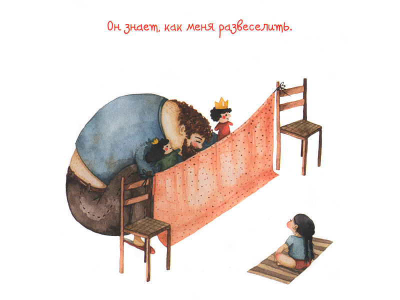 И, возможно, девочка, от имени которой ведется рассказ о волшебном папе (в какой-то момент становится понятно, что папа – волшебный), сможет передать чувство защищенности маленькому читателю – хотя бы на то время, пока ему читают, а он смотрит на картинки.