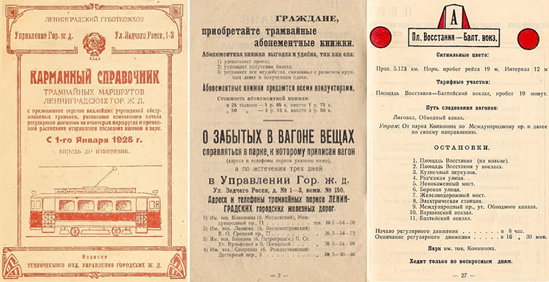 Пока дети придумывали истории, учитель нашла в Интернете копию карманного справочника трамвайных маршрутов Петербурга-Ленинграда 1925 года, где указаны номера трамваев и комбинация сигнальных огней как дополнительное обозначение маршрута, остановки и расписание. В конце справочника есть памятка пассажиру: «О забытых в трамвае вещах справляться в парке, к которому приписан вагон, а по истечении трех дней в Управлении городской железной дороги (ул. Зодчего Росси, 1‒3, комн. 150)». Используя карту города и справочник, дети выбрали маршрут и остановки, где могли быть потеряны вещи из их рассказов, и собрали «забытые предметы» для отправки в депо.