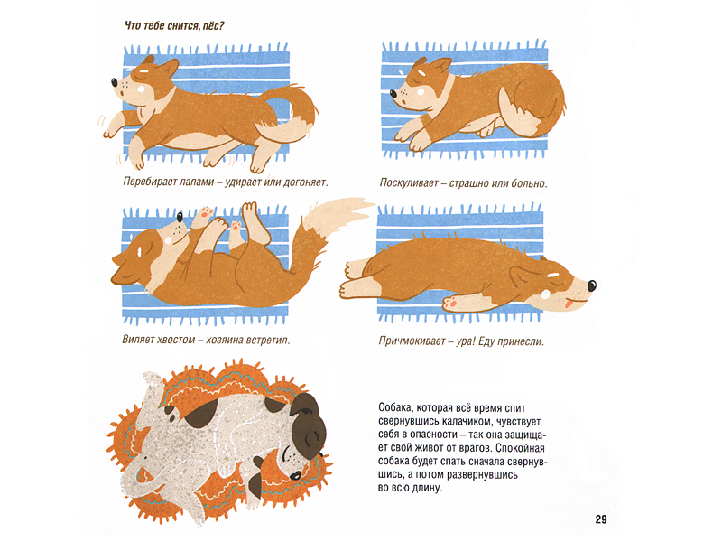 А с ребенком постарше, лет пяти-шести, я думаю, интересно будет взять эту книжку в зоопарк и почитать прямо там, у соответствующих вольеров. Может получиться очень интересный опыт соединения теории и собственных наблюдений. Мои дети всегда ужасно расстраиваются, когда мы подходим к какой-нибудь клетке, а зверек мирно спит, разомлев от жары. Зато теперь, на волне возникшего интереса, можно будет предложить внимательно понаблюдать за сном животных. А можно понаблюдать за утками в пруду рядом с домом или за собственной собакой и кошкой (давай проверим, верны ли предположения ученых?). Кто знает, что может из этого получиться? Даже если эта игра и не станет долгосрочным проектом наблюдений за природой, все равно она разовьет интерес ребенка к живым существам вокруг него.