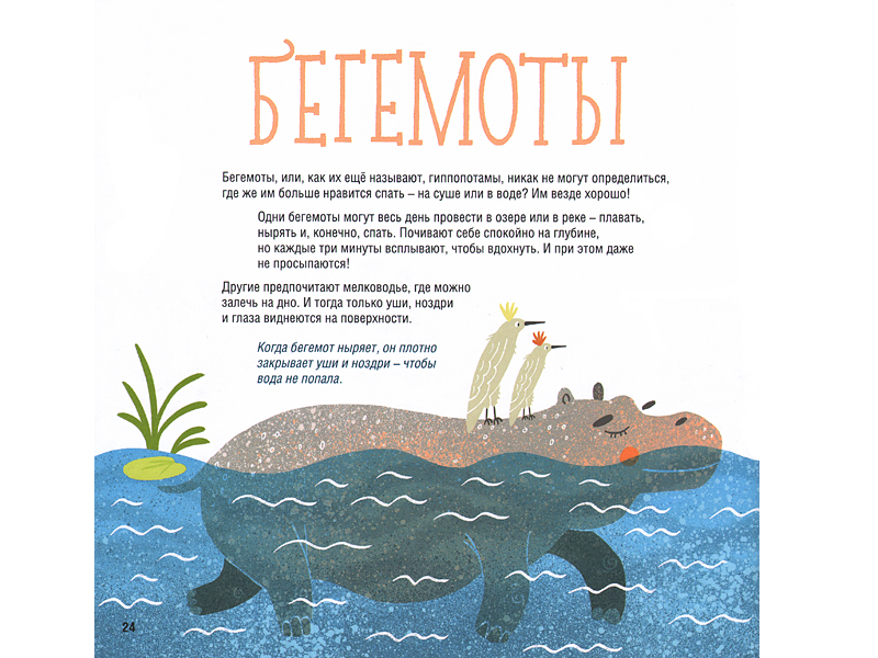 Издательство «Пешком в историю», выпустившее эту книгу, гарантирует строгую научность, консультант издания – кандидат биологических наук. Но поскольку книга предназначена для дошкольников, научная информация подана в ней через забавные и неожиданные факты. Конечно, здесь есть все, что непременно должно быть в книгах для малышей – яркие смешные картинки, которые надолго притягивают внимание, небольшие, но очень информативные тексты, написанные на стыке смешного и серьезного. Например: «У дельфинов одна половина мозга спит, а другая следит за членами семьи и за тем, чтобы вовремя всплыть за новой порцией воздуха». Или: «Несмотря на то что жираф ‒ самое высокое животное в мире, врагов у него много. Как тут заснешь, когда из темноты на тебя повсюду таращатся хищники?» Только попробуйте представить себе это! Конечно, все эти невыспавшиеся жирафы и дельфины тут же запоминаются ребенком.