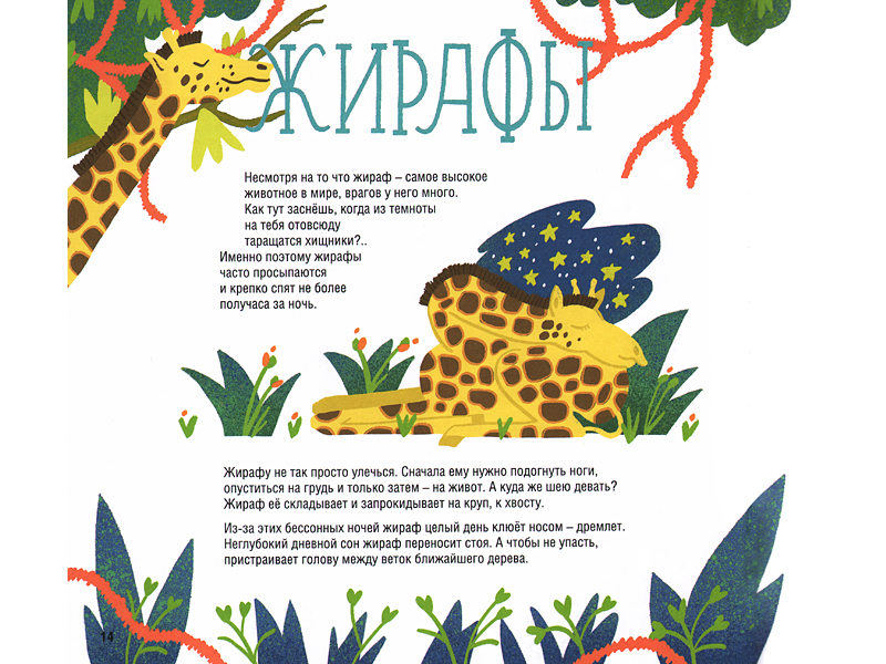 Если ребенок еще маленький, совсем не обязательно читать всю книгу подряд. Каждому животному посвящен свой разворот, так что можно выбрать именно то, что подойдет сейчас этому конкретному малышу в зависимости от его возраста, возможностей и интересов. Среди героев книги есть и старые знакомые (кошки, собаки, лисы, медведи, ежи, слоны и жирафы), и довольно экзотические персонажи, вроде морской выдры калана. Но даже и знакомые животные поворачиваются к малышу своей новой стороной, потому что Евгения Гюнтер постаралась отыскать самые неожиданные подробности их сна.
