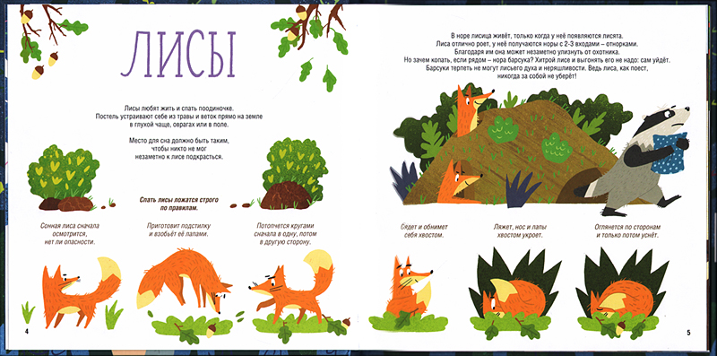 Художник Наталья Карпова иногда создает на странице небольшие, но очень эмоциональные «мультики», которые интересно рассматривать и обсуждать с малышом, особенно при самом первом чтении. Можно даже закрыть страницу и сначала немножко поговорить о том, что предстоит увидеть. Как, ты думаешь, спит лиса? Залегла в норку и все? Открываем страницу, и оказывается, что у лисы разработан сложный ритуал отхода ко сну, который «покадрово» нарисован художницей. Конечно, малыш удивится, а значит, и запомнит. Еще философы древности говорили, что удивление – начало познания. А в этой книжке малышу постоянно приходится удивляться. Значит, и процесс познания идет полным ходом. Я думаю, именно поэтому автор так часто «отвлекается» от основной темы и вставляет в текст интересные сведения об устройстве звериных нор, питании, потомстве, расширяя кругозор читателей.