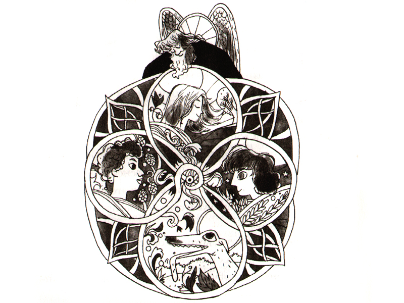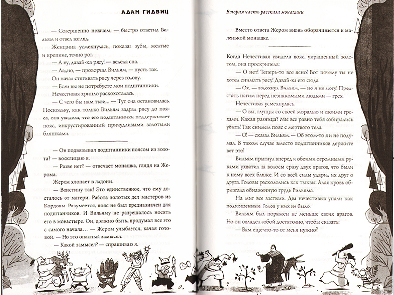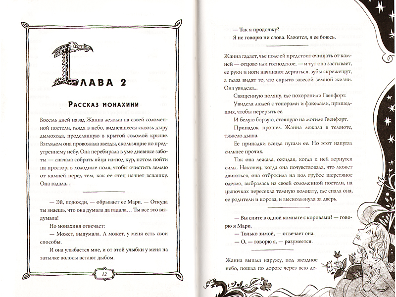 Чтение этого романа похоже на распутывание детективной истории. Каждая глава ‒ это рассказ одного из постояльцев трактира «Святой перекресток», которые коротают дождливую ночь за кружкой эля. Перед нами проходят рыцари, монахи, бродячие актеры, студенты, друзья самого короля Франции и, наконец, инквизитор. Все они в разное время видели троих удивительных детей с собакой, но каждому известна только небольшая часть их приключений и поэтому рассказ всякий раз обрывается на самом интересном месте. Кто-то считает этих детей святыми, а кто-то – еретиками, которых нужно поймать и убить, потому что они ведут себя странно, необычно. С каждым новым поворотом сюжета мы все глубже погружаемся в пестрый средневековый мир. И никогда не угадать, что ждет тебя в следующей главе. Этому помогает и иллюстратор книги, который назван здесь средневековым словом «иллюминатор». Раньше я думала, что это слово обозначает только окошко в корабле. Тут тоже открывается окошко ‒ в целую эпоху.