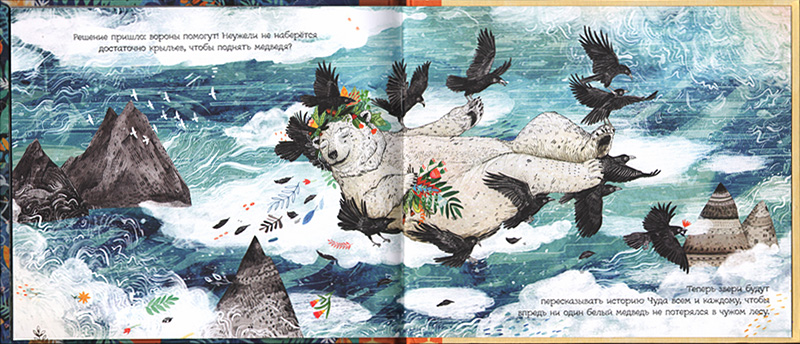 Темные волны разбушевавшегося моря выбросили на берег необычное огромное существо, покрытое белым мехом. Обитатели прибрежного дикого леса никогда не видели таких зверей. Испугавшись, они не рискуют подходить к нему близко. А это существо ‒ Белый медведь, занимает пустую пещеру далеко на холме. Из гибких тонких веточек и широких листьев он пытается смастерить себе крылья, раз за разом разбегается, прыгает с утеса ‒ и каждый рад падает в море. Обитатели дикого леса осторожно наблюдают за ним из кустов, не решаясь подойти поближе, и страстно мечтают, чтобы медведь от них улетел. И вот однажды, когда после неудачной попытки взлететь волны снова выкинули медведя на берег, мудрые вороны решили с ним заговорить. Медведь рассказал, что он жил среди снега и льдов на Северном полюсе, но вдруг большая льдина откололась, и течение унесло его в дальние южные края. Он отчаянно хочет вернуться домой. И звери дикого леса решают ему помочь. Вороны, зацепив медведя когтями за мех, несут его через море на север. На последней странице Белый медведь с зелеными цветами на голове бредет со своей семьей по ледяной тропинке...