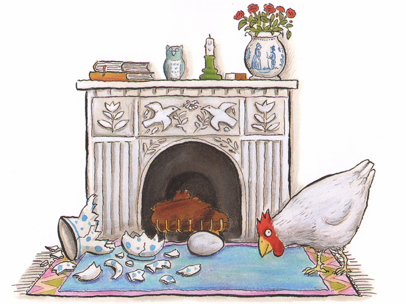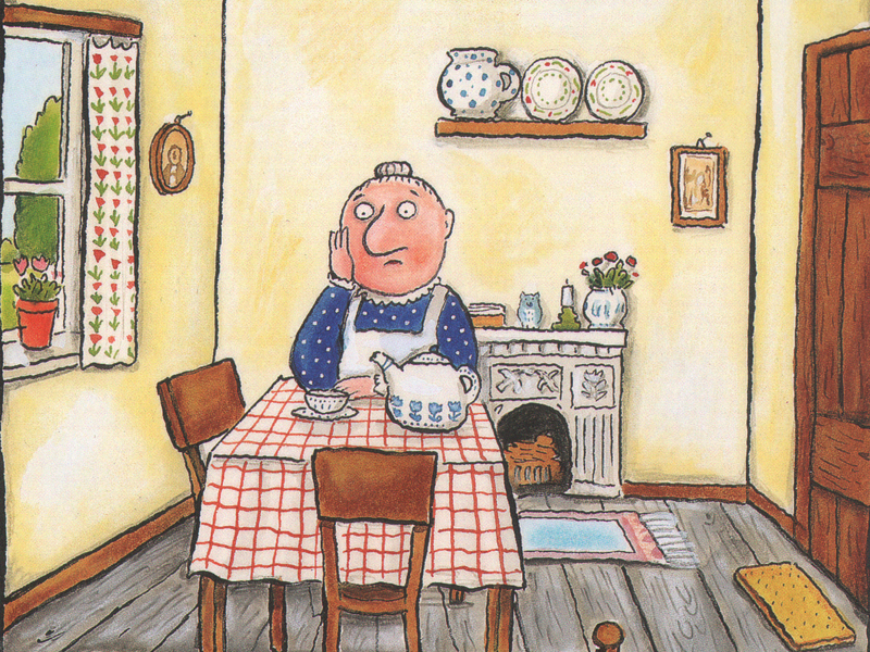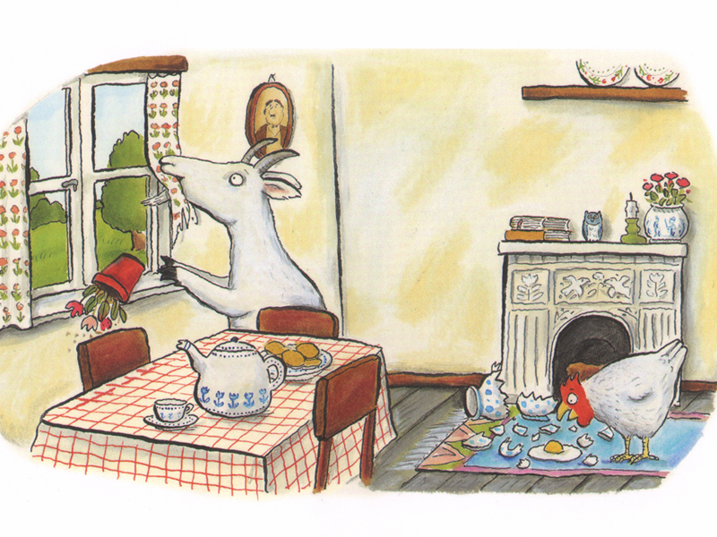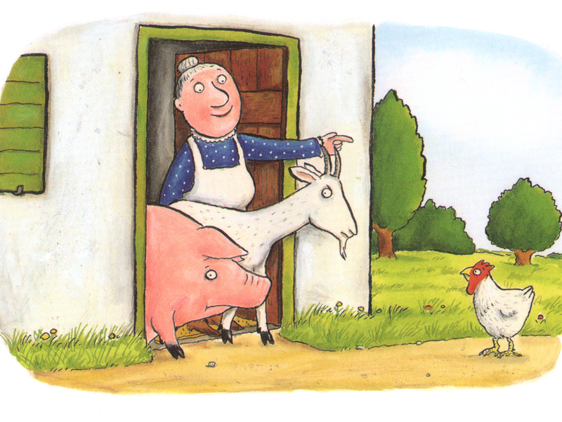 Этим летом я была на конференции по детской литературе в Лондоне, где Джулия Дональдсон читала, вернее, пела и разыгрывала свою маленькую поэму. Пели хором Джулия и ее муж Малькольм, а в качестве коровы, козы, свиньи и курицы подвизались добровольцы – молодые участники конференции. Джулия-старушка поочередно загоняла их в дом, где они занимались всякими пакостями при помощи нехитрой пантомимы: жевали скатерть, бодались, махали крыльями – в общем, устраивали старушке тяжелую жизнь. И сразу стало понятно, что в домике просто «негде ступить, даже негде чихнуть». Такая грустная история.