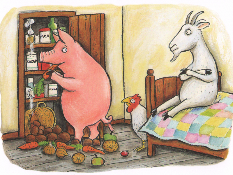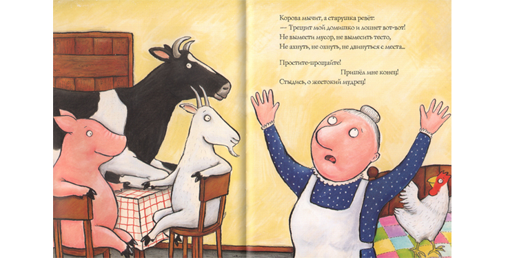Итак, о чем же книжка? Старушка живет в маленьком тесном домишке, где и так негде повернуться, и по совету мудреца-философа поселяет в домике сначала корову, а потом еще и козу, и свинью, и курицу. Можно себе представить, что творится в домике! Бесконечные ряды домашних животных в иллюстрациях Акселя Шеффлера, использованных и в русском издании, только усиливают ощущение тесноты. Что бы ни происходило, старушка продолжает жаловаться и упрекать философа-советчика в том, что он подает неправильные советы: «Простите-прощайте! Пришел мне конец! Стыдись, о жестокий мудрец». Такая незамысловатая история.