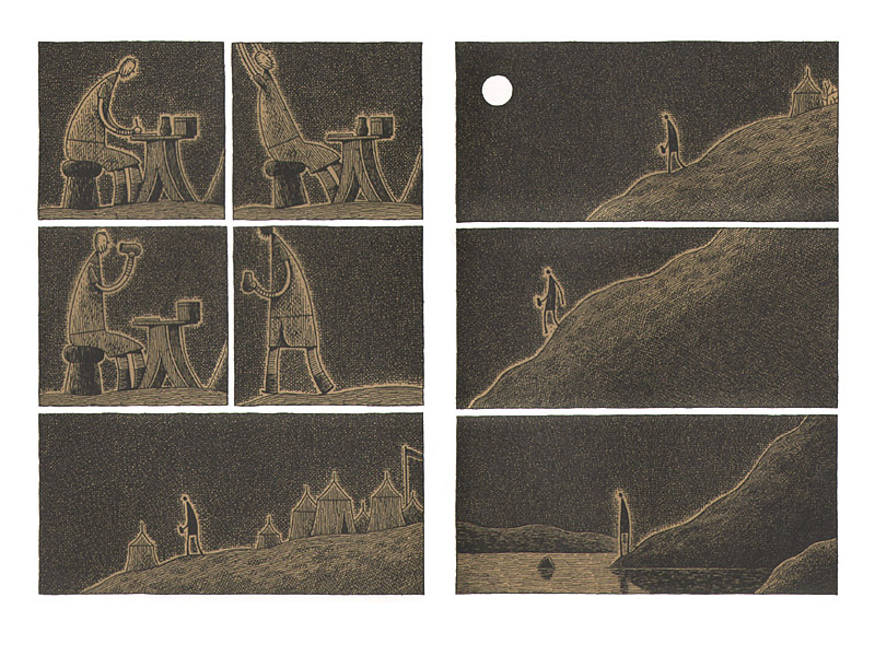- I’m no expert on Japanese poetry but I understand what Victor Melamed meant to say. In my work, I try to convey the characters’ thoughts and feelings without naming them directly and without giving the reader any of my own judgments. Mooncop never says he’s lonely, and Goliath never says the world around him is unfair but as we leaf through the pages, we sense that. I do try to use as few details as possible to capture the feelings of my characters. I think this approach brings readers closer to the hero. In comics, the most interesting part happens “between the lines,” in the space between pictures. The reader is left alone with the characters, without any hints from the author, and tries to understand what the characters experience when the author is silent. In that moment the reader puts himself in character’s shoes, lives out a part of his life and experiences what he does. What’s important is that the space between pictures not be so big that the reader loses track of the narrative.