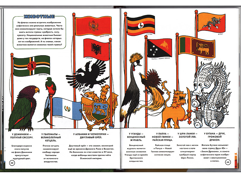 Подобные элементы интерактива ‒ всегда большой бонус. Благодаря такой игре мы еще несколько раз пролистали книжку, каждый раз находя что-то новое. А в конце книги можно было бы еще и отыскать все страны на картах и нарисовать свои собственные флаги, но на это у нас уже просто не хватило сил – оставили на потом. Тем более что рисованием флагов Матвей уже «переболел» во время чемпионата.
