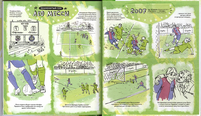 – Месси, Месси! Смотри, мама, тут про Месси: «Нападающий “Барселоны”, 19-летний аргентинец Месси, получает мяч в центре поля, у правой бровки, и устремляется к воротам соперника. Одним движением Месси пробрасывает мяч мимо двух защитников, мастерски уходит от подката, врывается в штрафную...» Одним движением, мама!
