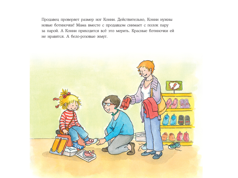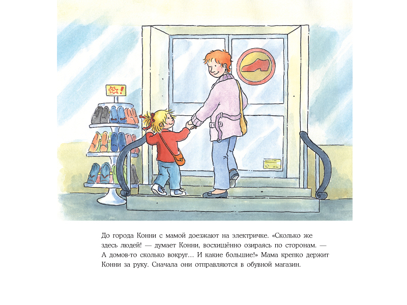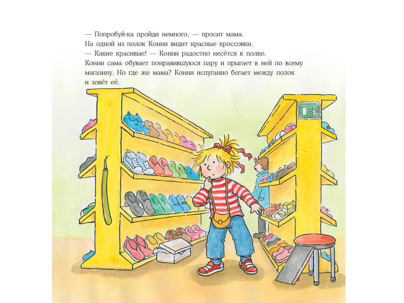 Девочка Конни – живая и обаятельная шалунья в яркой полосатой майке, и ей, по счастью, достались такие же живые родители и бабушка, которые не ограничивают ее жажду познания мира. Но время от времени Конни сталкивается со сложными задачками, вроде той, когда она потерялась в огромном супермаркете. И вот что интересно: автор не предлагает сразу инструкцию по спасению и уж тем паче не стыдит детку за упрямство и непослушание (как делал, например, Михалков в «Упрямом лягушонке», посвященном похожей теме). Теперь, к счастью, время другое, и мы понимаем, что одними нотациями и инструкциями детей не воспитаешь. Поэтому Лиана Шнайдер подробно описывает настроение малышки Конни, ее радость от шопинга (довольно распространенная эмоция сейчас, когда для многих семей удачный уикенд равнозначен семейному походу в торговый центр). Детально описан сам процесс выбора обуви и одежды, а это ведь тоже важный для детей социальный опыт – научиться покупать вещи осмысленно, а не хватать все подряд. Ситуация подана ребенку максимально реалистично, узнаваемо. При этом, с большой любовью к ребенку – Конни потерялась в магазине, убежав от мамы не по своеволию, а по обычному детскому импульсивному желанию: она вдруг заметила, что ее сумочка с карманными деньгами пропала, и побежала ее искать. И, разумеется, потерялась сама.