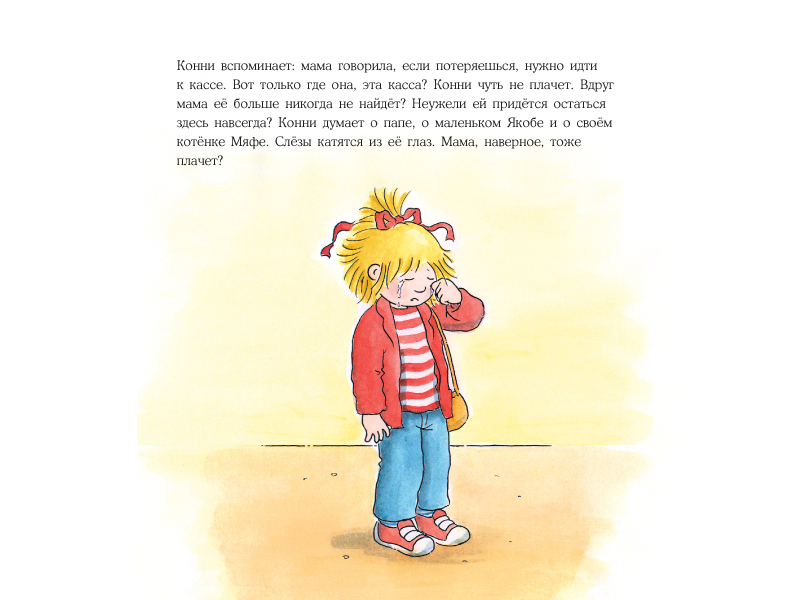 Я до сих пор помню это чудовищное, липкое, мерзкое ощущение – ты один в этом мире. И никто тебя не спасет… Нет, ты даже не один. А еще хуже. Рядом с тобой малыш, за которого ты внезапно сделался ответственным. Потому что он еще меньше тебя. А тебе – очень страшно. Потому что ты не знаешь, где все и куда идти. К счастью, та история двух детей, потерявшихся на пустынном морском берегу в закатный час, закончилась удачно. Иначе мы бы сейчас с вами не разговаривали. Мы сумели найтись. Почти чудесным образом. И мама так и не узнала, что мы потерялись. Но когда я стала взрослой и у меня появились свои дети, как только они стали со мной ходить куда-то дальше двора и ближайшего магазина, я постаралась объяснить им, что делать, если потеряешься. Мне в детстве почему-то никто этого не объяснял, разве что «надо подойти к дяденьке милиционеру и назвать свой адрес». А если нет этого дяденьки? А если не помнишь с перепугу адрес? А если... Подросшие старшие и даже средний хорошо ориентируются в пространстве без мамы. Но вот теперь я точно могу не беспокоиться даже за самого маленького, четырехлетку, который пока еще рядом. Книжная серия про девочку Конни, с которой все время что-нибудь приключается, – одна из наших любимых, перечитанная многократно. И, конечно, там есть история «Конни потерялась в магазине».