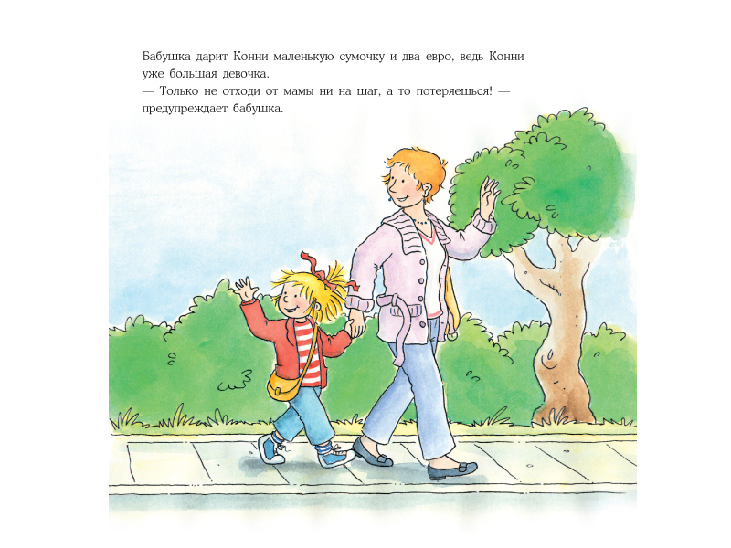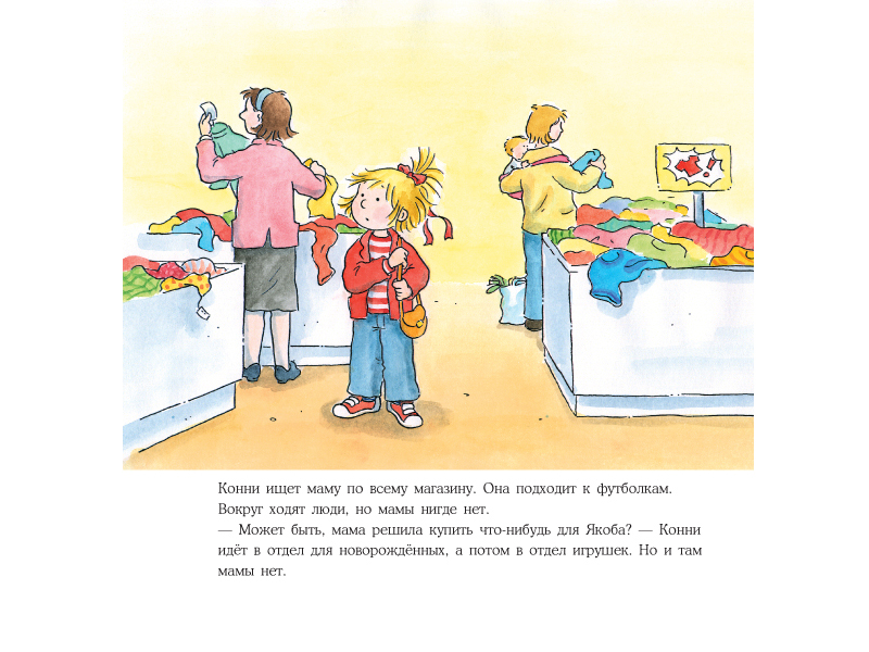 Читая эту книжку с ребенком, мы, конечно, обсудим, как делать покупки в магазине – для 4‒5-летних это чрезвычайно интересно и часто становится темой ролевых игр. Конечно, поговорим о том, как вести себя, если все-таки потерялся, и как не потеряться. Но я все меньше верю в прямое научение, даже через игры и подражание. Как-то гораздо сложнее устроена жизнь и процесс воспитания. Честно говоря, больше всего я порадовалась за взрослых читателей, за молодых мам маленьких детей. Мама Конни, несмотря на то, что случилось УЖАСНОЕ, сумела сохранить самообладание и спокойно обсуждает с дочкой случившееся в кафе, а не «сливает» свое напряжение в криках «ты куда подевалась, я все глаза выплакала!» или в шлепках, или в «больше никогда не возьму тебя в магазин!». А ведь ее дочка еще очень маленькая и дома остался с бабушкой новорожденный малыш. Можно себе представить внутренний эмоциональный мир молодой мамы, правда?.. Вот это тоже очень важный опыт для всех читателей, и маленьких, и больших. Правда, это конечно, очень европейский способ реакции на катастрофу: да, случилось, давай поговорим об этом. Но не будем мусолить бесконечно ‒ мы же решили проблему. Все закончилось хорошо. Я тебя люблю. И, конечно, мы снова придем сюда. Больше того, Конни получает возможность потратить свои два евро на игрушку для новорожденного братика. При этом она крепко держится за маму, которую так любит.