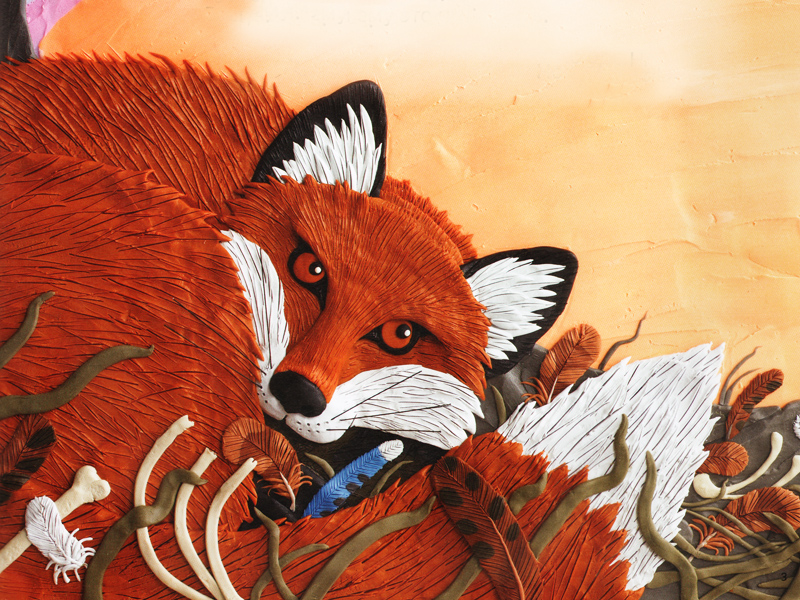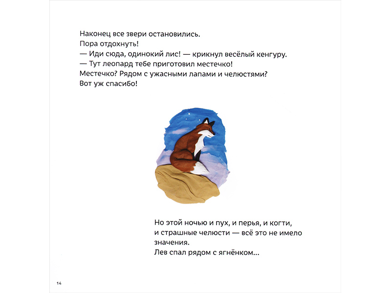 И главный персонаж книги неожиданный – Лис. Причем – одинокий. Как-то утром одинокий Лис вылезает из норы и чувствует «в воздухе» необычное напряжение. Лис бежит на разведку – и оказывается внутри звериного шествия. Звери куда-то идут, не обижая друг друга: в пути «лев спит рядом с ягненком». Причем идут парами – «он» и «она». Очень странно!