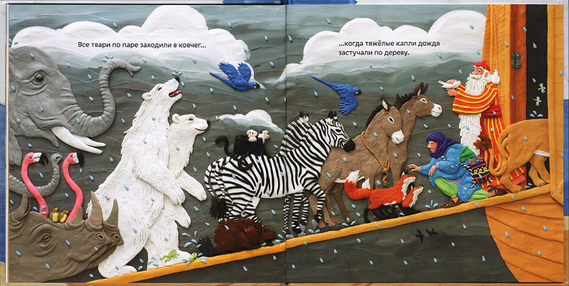Спасение Ноя, его семьи и «животного мира Земли», укрывшихся на странном корабле доме во время Великого Потопа, – пожалуй, один из самых популярных библейских сюжетов, разрабатываемых в детской художественной литературе. Это, видимо, связано с тем, что здесь задействованы звери. А их образы «от природы» динамичны и привлекательны для детей.