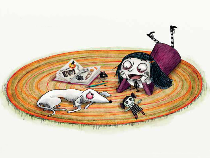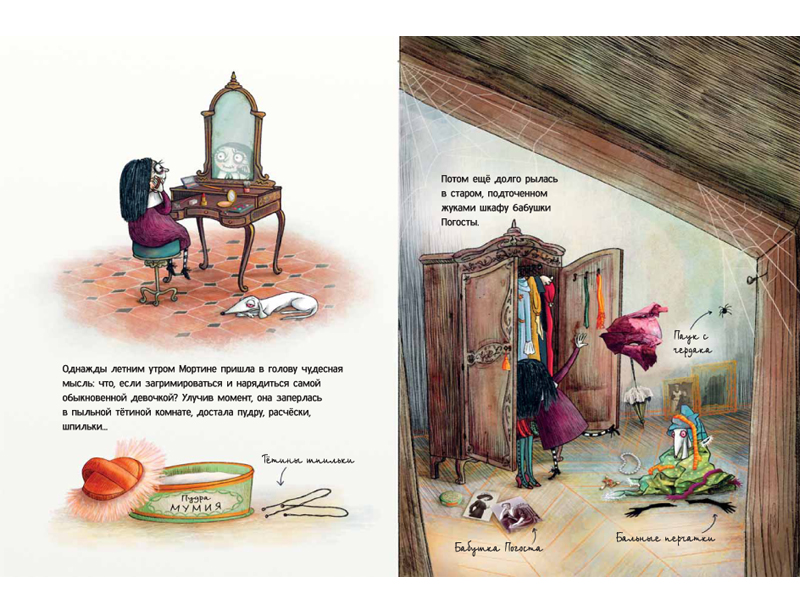 «Мортина» - трогательная история про девочку-зомби, которая мечтает обрести друзей-людей. Никаких поеданий, никаких кровавых подробностей. Все по-сказочному и с юмором. Может быть, картинки в книге слишком детские, но в этом и состоит очарование! Благодаря обилию картинок, эта книжка похожа на комикс. Мы взяли ее с собой в поликлинику и читали, сидя в очереди к врачу. Сначала Матвей скептически отнесся к главной героине-девочке, но скоро увлекся иллюстрациями и – самое ценное – многочисленными подписями на полях. Эти незатейливые «почеркушки» встречаются почти на каждой странице. Например, на одном из разворотов Мортина красуется перед зеркалом, а вокруг разбросаны вещи. Каждую вещь сопровождает «пояснительная записка»: «Модный нарядный бант», «Шляпа тети Усоплы (у нее есть и получше)», «Доктор Упокой (тетина старая любовь)» и т.д.