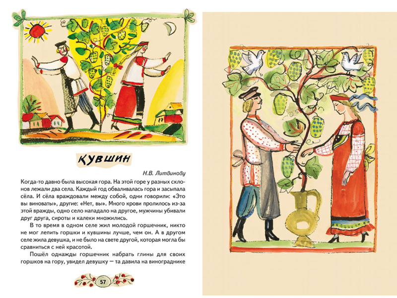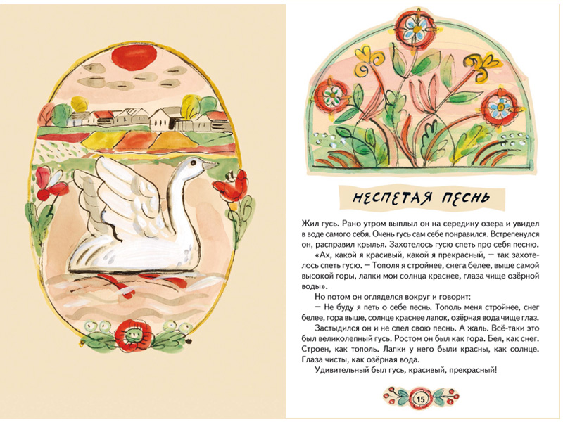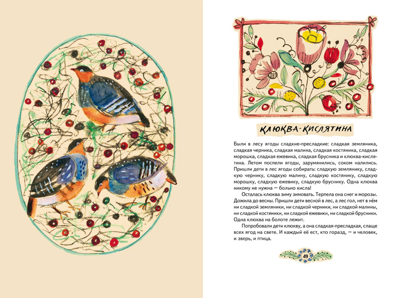 А вот короткая, длиной в абзац, сказка «Клюква-кислятина». Кислая, с горчинкой клюква – единственная ягода, которую осенью никто не хотел собирать. Пришлось клюкве зимовать на болоте и «терпеть снег и морозы». И вдруг всё изменилось: стала болотная клюква «сладкая-пресладкая, слаще всех ягод на свете. И каждый ее ест, кто горазд, – и человек, и зверь, и птица». На первый взгляд, это зарисовка о природе. Но за иносказаниями открываются темы, которые касаются каждого: обманчивость первого впечатления, умение терпеть и ждать и, возможно, верность себе.