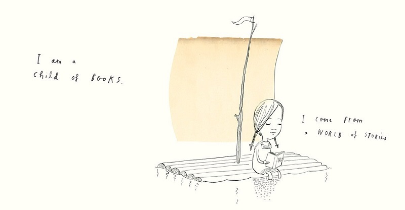 Reading became our game—one that no one, including me, took seriously. That’s why I never saw it as a skill to learn or an assignment to be completed. If I had encountered Oliver Jeffers’s A Child of Books Newest English edition: Candlewick Press, 2016. ISBN 9780763690779. then, I would have said it was a book about me. In the story, a little girl from the world of books sets off on a journey across the ocean of fantasy. She is made of thousands of words and her imagination allows her to reach the farthest corners of the universe. The child of books needs a friend but can’t find one. (Mikhail Prishvin’s Mikhail Prishvin was a Russian/Soviet writer. famous words on language come to mind: “The point was not so much to learn, as meet my native language as a friend, and I had to seek out that meeting.”)