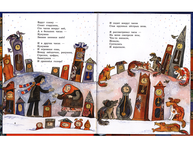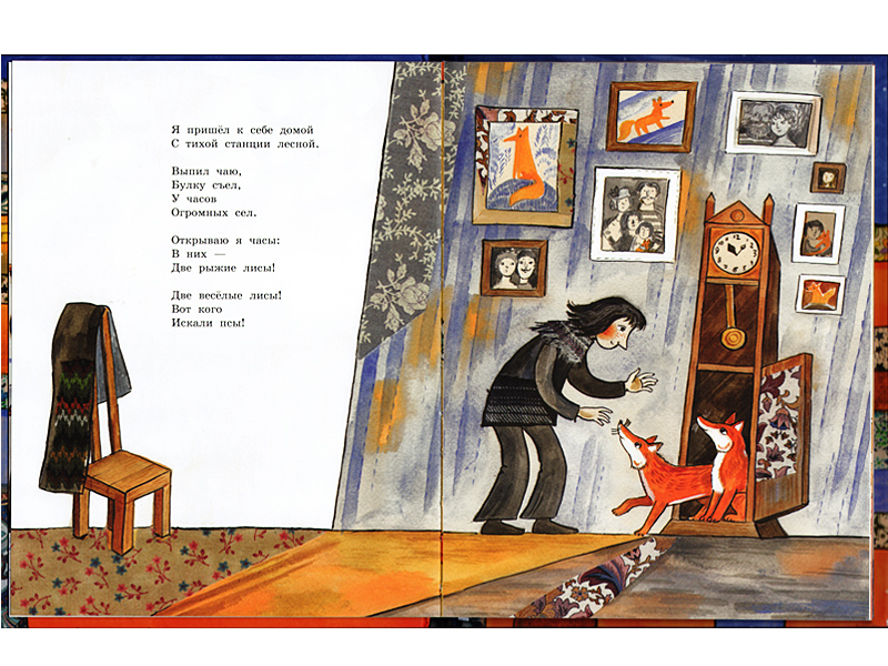 Часы и псы уже рифмуются, подготавливая той же рифмой к появлению лисы. И она появляется, да еще и не одна. Сразу две огненно-рыжие лисы. Откуда ни возьмись, выскакивают прямо из огромных часов.