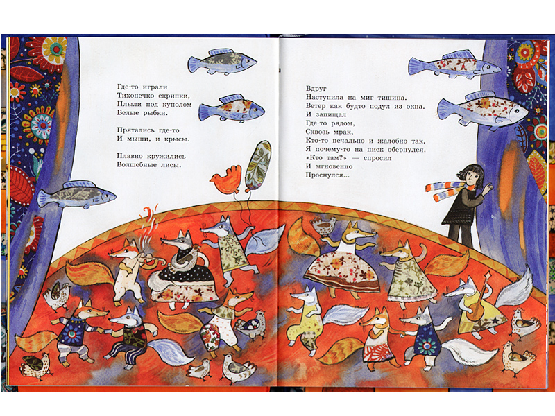 Скачет текст, меняется стихотворный размер, скачут, танцуют рисунки – на одной странице пляшут самовары, на другой их танец подхватывают лисы. Тут лисы вполне звери, на четырех лапах, а тут они в юбках, штанишках и шляпах, и от них куда-то уплывают рыбки. На следующую страницу, в сон о цирке со множеством танцующих лис.