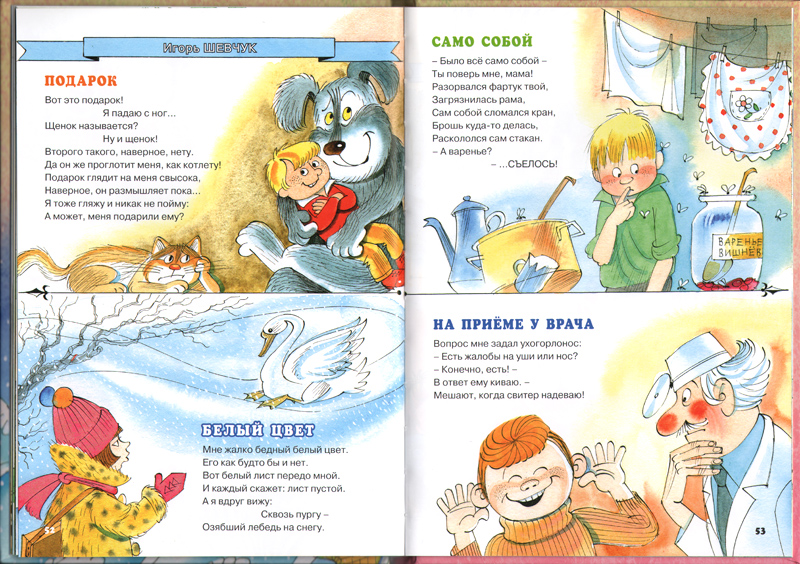 Хотя, может быть, правильнее было бы сказать, что разнообразные, теплые, ироничные рисунки Чижикова были проиллюстрированы стихами, – настолько в этом сборнике (на страницах которого сошлись имена трех десятков нынешних детских поэтов) присутствие художника стало определяющим.