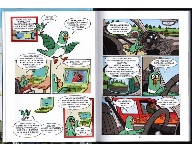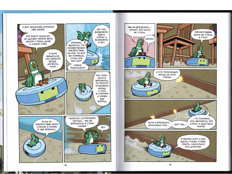 Ко всему прочему, «Роботы» мне напомнили одну из самых любимых книжек моего детства – «Энциклопедию профессора Фортрана». Как и в «энциклопедии», в «Роботах» есть птичка, которая ведет нас по страницам от начала и до конца. Но если в старой версии это был воробушек, то здесь это первая птичка-робот по имени Пули.