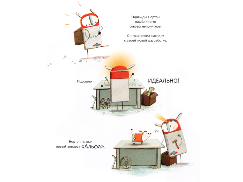 Нортон жил один и собирал на улице всякую всячину, совсем как Матвей во время прогулки. Банки, палки, пружинки, потерянные детали конструкторов… А однажды взял и сделал из них собаку-робота по имени Альфа, которая и помогла ему найти очень странную штуковину…