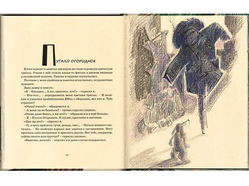 Вот, например, Шаня берет Кикерика за ухо и тащит куда-то. Кикерик рассказывает: «Мы прошли по темному коридору и поднялись наверх по каким-то полочкам. Каждая полочка со мной поздоровалась: “Пум-пум-пум…”»