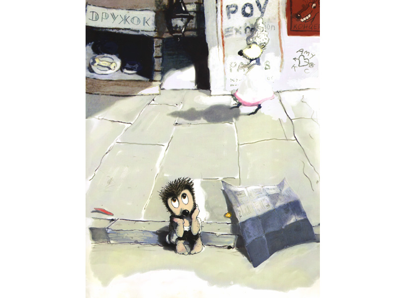 Мы начинаем читать и узнаем, что ежика Элвиса никто не хотел обнять. А ему так не хватает нежного дружеского объятия, он просто мечтает об этом. Ежик идет по улице и обращается к прохожим: «Обнимите меня, пожалуйста!». Он видит, как обнимаются болельщики на футболе, как в больнице все обнимают родственников и друзей. А его прогоняют и называют «колючкой», «репейником», «кактусом на ножках». Взъерошенный, грустный, ежик огромными глазами смотрит со страницы книги прямо на нас Сережей, но видит лишь спины отвернувшихся от него случайных прохожих и огромную обувь. Сережа не выдерживает: