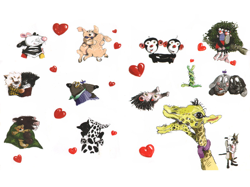 Довольный Сережа еще долго рассматривает изображение разных пар животных на форзаце книги. «Каждой твари по паре» ‒ здесь и влюбленные жирафы, и романтичные свинки, и пара не совсем подходящих друг другу собак, медвежата, мышата, обезьянки, рыбки, кроты и даже червяки.