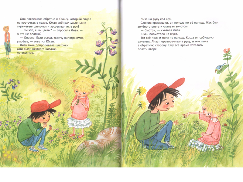 Лиза и Юхан стали играть, потому что автобус долго не приезжал. Они играли с жуком: жук переползал с пальца Лизы на палец мальчика: я представляю будто это я и Егор, мы с ним вместе на рисование ходим.