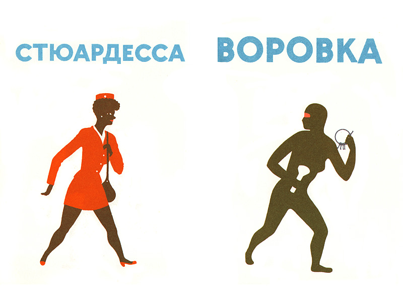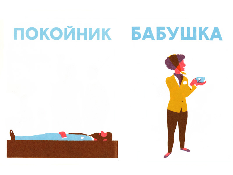 Собственно, в этом и заключена главная задача автора-художника – показать невероятную плотность и многообразие жизни. И, что очень важно, на каждой странице мы видим не только образ (или пару образов), но и написанное крупными буквами слово, которое обозначает социальный статус, тот или иной признак или условную «специализацию» персонажа.