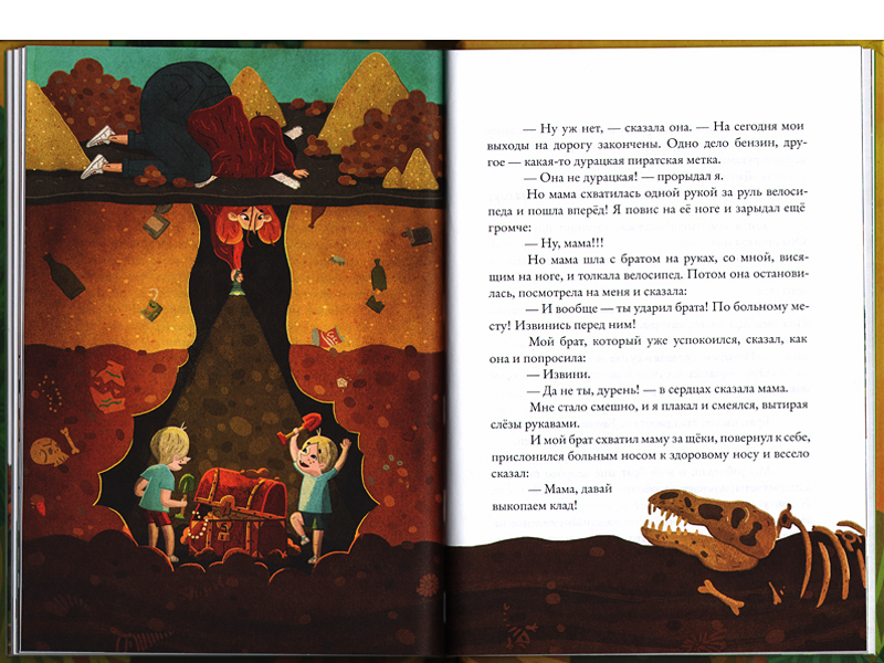 Наташа мастер вплетать фантастическое в реальное. Так что создается полное впечатление, что так и должно быть. Например, что под каким-то крестиком на асфальте может храниться настоящий пиратский клад. Или что квартира в один миг превращается во дворец с большими королевскими покоями. И мама из книжки этому нисколько не удивляется. Наоборот, радостно запрыгивает в покои и просит оставить ее в покое. Эту шутку Матвей не понял, пока я ему не объяснила. Зато сама смеюсь каждый раз, как вспоминаю, и повторяю теперь ежедневно перед сном.
