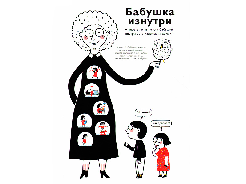 Что у них внутри? «Маленький домишко», в котором живет «одна малышка». Это и есть бабушка, только в виде девчонки, которая любит попрыгать, поесть сладкого, повеселиться и постоять на голове.