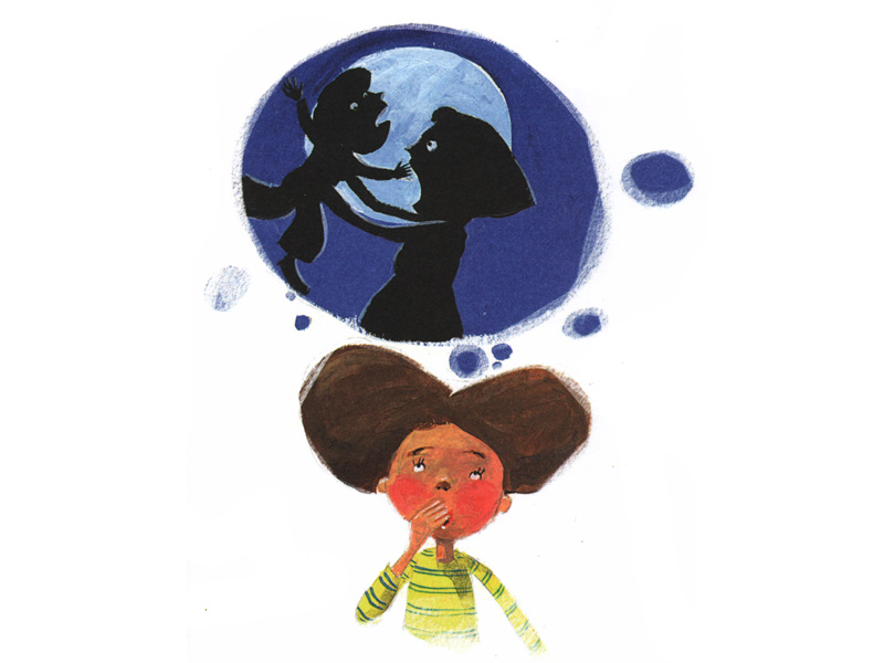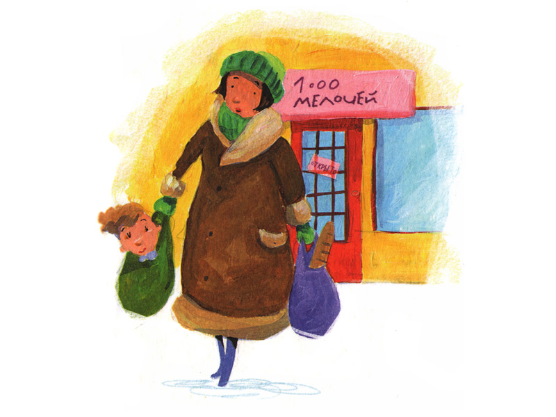 Сцена, напоминающая фильм ужасов: снизу под дверями туалета видны только ноги воспитательницы. Сережа смотрит на иллюстрацию так, как будто мы находимся вместе с ребятами в кабинке туалета. «А Мила Филипповна так близко, так близко…»