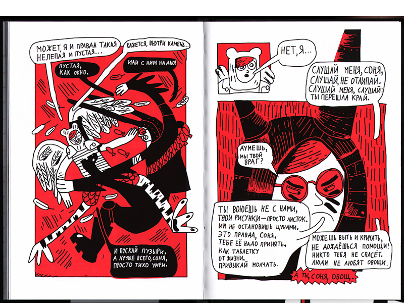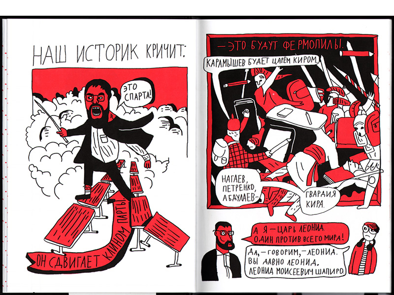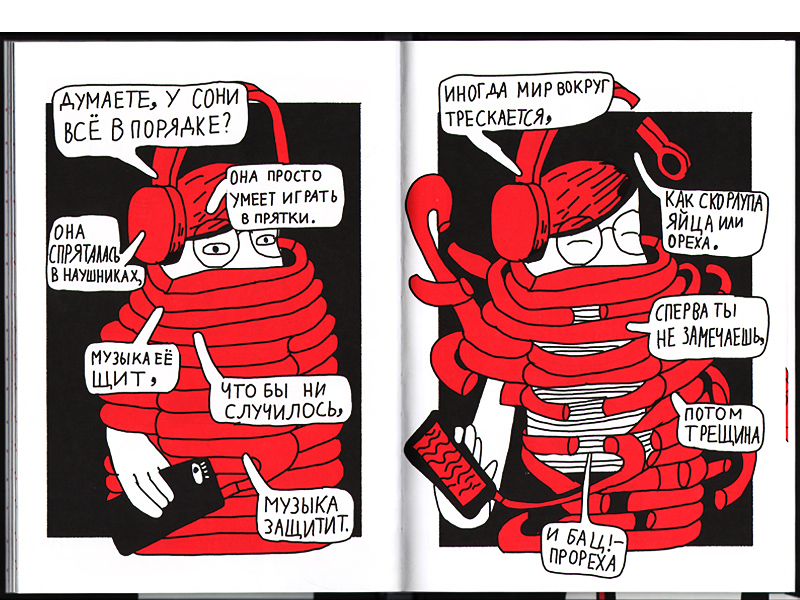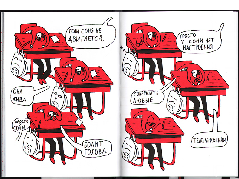 Книгу можно условно разделить на две части. В первой Соня рассказывает о себе и своём школьном дне. Конечно, её рассказ нельзя назвать объективным, но нам же в первую очередь интересно её мнение? Мы видим происходящее в черно-бело-красной расцветке, которая сама по себе предполагает постапокалиптическое настроение. Из-за этого мы не сразу замечаем, что Соня учится в неплохой школе: на уроке биологии они препарируют рака, на физике проводят эксперимент с вакуумом, и учитель истории у них очень творческий.