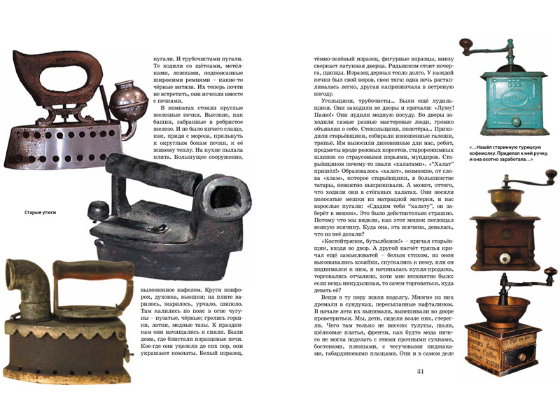 За вещами, профессиями и обычаями стоит Ленинград 1930-х годов – с мостовыми, выложенными булыжником или деревянными шашками-торцами (пытаемся представить их «смолисто-дегтярный запах» в жару). А на улицах гудят в клаксоны автомобили, звенят трамваи, покрикивают извозчики, зазывают к себе торговки, керосинщики, чистильщики обуви, точильщики: «Улица была шумной, говорливой, пахучей».