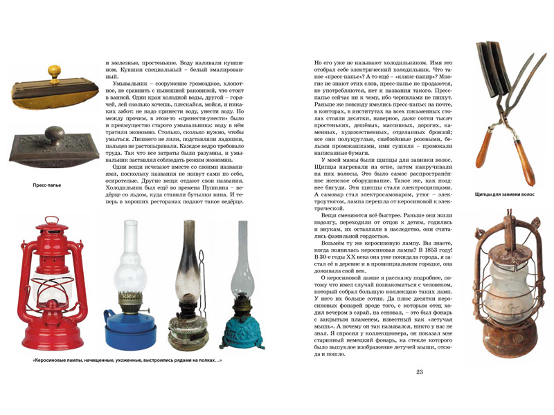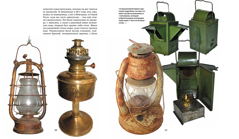 Например, автор рассказывает, что у одних его знакомых как семейная реликвия хранится керосиновая лампа. Она досталась от прадеда, сельского врача – тот делал при ее свете операции. Почти сто лет назад керосиновые лампы были разной формы и размера. Были лампы с рубиновыми стеклами для проявки фотопленки, переносные фонари «Летучая мышь» (название прижилось из-за выпуклого изображения летучей мыши на стекле первых, немецких фонарей). И до сих пор в корабельном компасе используются две маленькие керосиновые лампочки – для надежности.