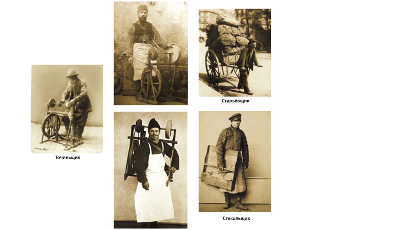 Со старинными вещами всегда связаны старинные профессии. Например, по дворам ходили точильщики и за плату точили топоры, портняжные ножницы, кухонные ножи, бритвы. Описание работы точильщика получилось даже красивым: «Станок у него с разными круглыми камнями – розовые, серые, совсем темные, тонкие и толстые. Жмет он ногой и прикладывает металл к точилу, оттуда несутся кометными хвостами искры разных цветов, как фейерверки. Точило жужжит, поет – на лезвиях появляется узкий чистый блеск отточенной стали». А бывало, во двор придет старьевщик (чаще всего татарин), скупающий ненужный хлам, и кричит «белым стихом»: «Костейтряпок, бутылбанок!» Или шарманщик с обезьянкой на плече.
