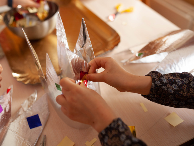 Еще мы готовим картонные мечи, вырезаем из фольги короны и украшаем их «самоцветами» (блестящей самоклеящейся бумагой). Это всех очень увлекает – и мальчиков и девочек.