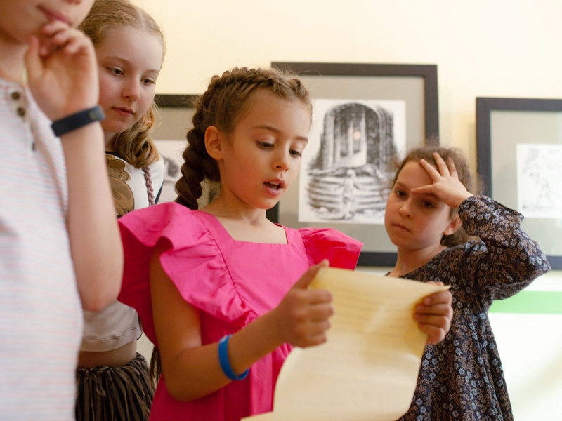 Для создания атмосферы есть также две небольшие витрины с открытками, изображающими Оксфорд и Лондон начала XX века. На личности автора, Клайва Стейплза Льюиса, мы в летней программе не фокусируемся, но в аннотации к выставке сказано, что в годы Второй мировой войны в оксфордском доме ученого и профессора Клайва С. Льюиса жили эвакуированные из Лондона девочки. Он хотел найти с ними общий язык и стал придумывать для них историю про волшебную дверцу, ведущую в Нарнию.